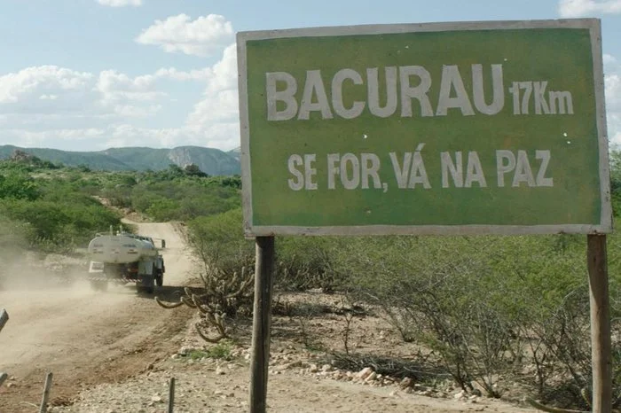 Na primeira sequência, onde Teresa (Bárbara Colen) está de carona em um “caminhão pipa”, com imenso tanque de água potável, com destino à cidade de Bacurau, e se defronta com um cenário de guerra, de disputa pela água com tiros e mortes, implica que estamos entrando em uma narrativa onde existe um grande conflito armado em curso.